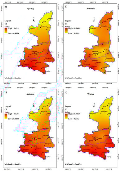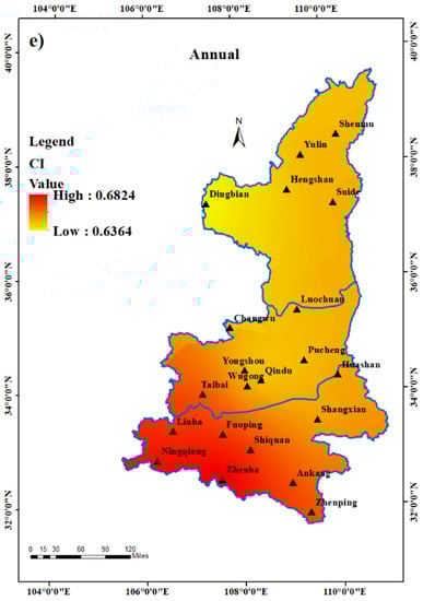 3.3. Temporal and Spatial Distribution of Precipitation Concentration Index