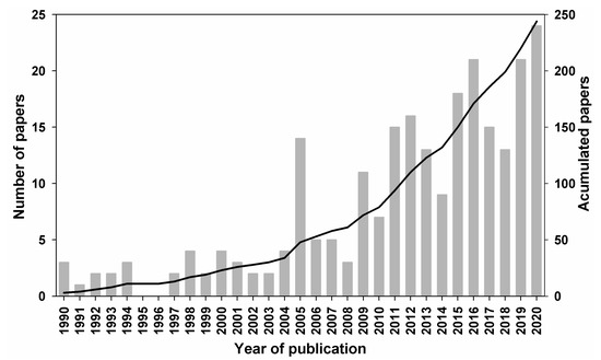 Number of published (bars) and accumulated (line) papers per year during the 1990–2020 period.