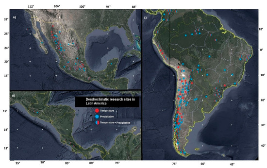 Location of dendroclimatic research sites in Latin America, (A) North America, (B) Central America, and (C) South America. The red label stands for temperature, the blue label indicates precipitation, and the blue-red label indicates analysis for precipitation and temperature in the same research.