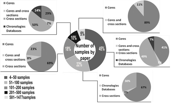 From the published dendroclimatic papers, 42.2% used increment-cores, 4.1% cross-sections and increment-cores, 13.5% cross-sections, 3.7% were based on available tree-ring series from international databases, and 36.5% did not mention the type of samples used. On average, 175 radii were used per dendroclimatic study. The highest sample size consisted of 1477 increment-cores, while others indicated 1159, 1082, and 916 core samples [25,26,27]. The lowest reported number of samples was of 4 cross-sections [28] (Figure 4). Although, most of the papers did not mention the number of samples used, some papers provide information on the number of sampled trees, the number of cores per tree, and the period in which the Expressed Population Signal (EPS) exceeded 0.85.