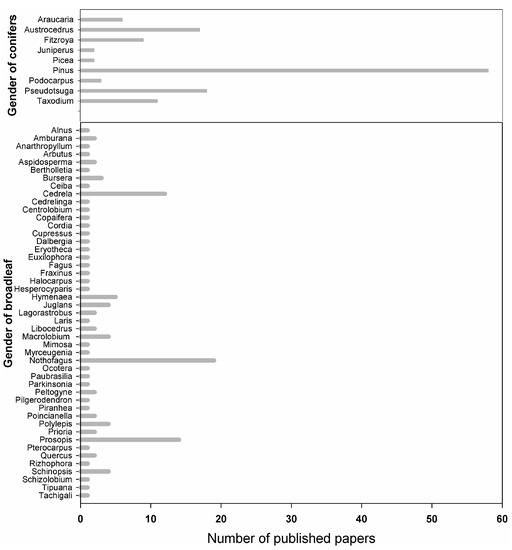 Conifers have been included in 61.0% of the dendrochronological papers published in Latin America, while broadleaf species in 39.0%—a high percentage of which grow in temperate areas and only 18.0% in dry or tropical climates. In Latin America, after 1990, the interest in dendrochronological research with conifers increased, as well as with other genera: Abies in 1991, Pinus in 2000, and Pseudotsuga in 2002. The publications with the broadleaf genera started with Nothofagus and continued with Juglans and Cedrela in 1989 and 1990 and had an increase in the years 2004 and 2005. Other broadleaf genera that have been used in dendroclimatic research are Prosopis, Fraxinus, Podocarpus, Schinopsis, and Macrolobium (Figure 5).