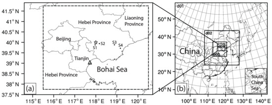 (a) Study area where the severe convective storm occurred. The black dots indicate the locations of the ground-based automatic stations (S1, S2, S3, and S4) that will be mentioned in Figure 4. The dashed rectangle area denotes the area analyzed in Figures 3, 7 and 8. The black triangle symbol represents the location (39.044° N, 117.717° E) of Tianjin weather radar that will be shown in the following part of the paper. The black asterisk symbol represents the grid point location (40° N, 118° E) of National Centers for Environmental Prediction (NCEP) Final (FNL) reanalysis data soundings that will be shown in Figure 6. (b) Geographic locations of the WRF model domains. The innermost domain (d04, i.e., the domain No.4) covers the whole area shown in (a).