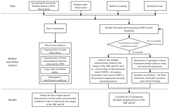 The dataset utilized in the present study includes conventional observational data from Doppler radar, ground-based automatic stations (with a temporal resolution of 1 h), and balloon sounding. All these observation data were provided by the National Meteorological Center of the China Meteorological Administration (Tianjin). The methodology used in this study is shown in a flowchart in Figure 2.