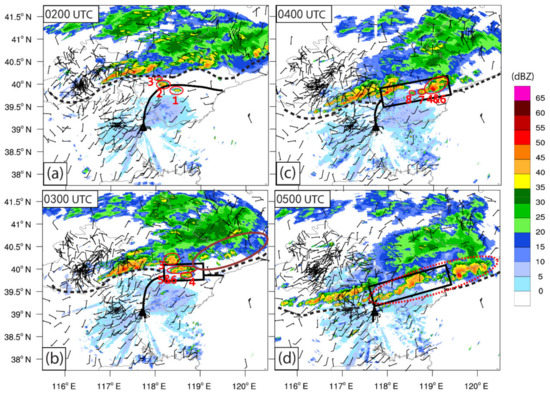(a–d) Composite radar reflectivity (shading, units: dBZ) observed by Tianjin radar station (indicated by black triangle) and wind fields (half barbs and full barbs represent 2 and 4 m s−1, respectively) observed by ground-based automatic weather stations on 31 July 2010. The black solid lines indicate the locations of the SBF, and black dashed lines denote the locations of the GF. The black rectangle area indicates the merging area. The locations of the convections initiated near the merging area are indicated by red ellipses or circles, and the numbers in red indicate the sequence number of the newly initiated convective cells. The solid brown ellipse shows the area where the convective system significantly weakened and (or) dissipated. The dotted red ellipse denotes the mesoscale convective system (MCS) initiated and (or) developed due to the merger of the GF and SBF. The specific time is shown in the upper left corner of each panel.