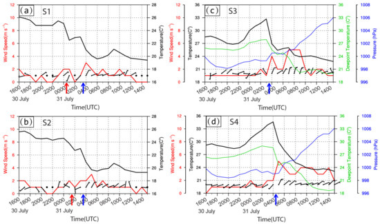 In order to investigate the basic dynamical and thermal characteristics of the SBF and GF, four ground-based automatic weather stations (S1, S2, S3, and S4 in Figure 1a) were selected near the merging area. The northeastern SBF showed an immature, weak, and quasi-stationary state during the whole merger process. Therefore, there was no obvious evidence related to the typical SBF recorded by the automatic weather stations near the northeastern SBF. Therefore, we selected two stations (i.e., S1 and S2) located near the southwestern SBF. Figure 4a,b show the basic characteristics of the southwestern SBF such as temperature drop and significant wind direction change. As the southwestern part of the SBF penetrated toward inland, it passed the station S1 during 0000–0100 UTC 31 July (indicated by red arrow). During this period, the wind direction was turned from northeasterly to south-southwesterly, with the temperature decline reaching ~2.5 °C. Similar temperature drop and wind shift were observed at S2 during 0100–0200 UTC 31 July, reflecting the passage of the SBF (the wind direction was changed from northwesterly to southerly, temperature decline reaching ~1.2 °C). There was ~1 h time lag between the time of the passage of the SBF in S1 and that of S2, which is likely due to the relatively northeast geographical location of the S2, such that the passage time of the SBF was slightly later than that of the station S1. Furthermore, the wind direction changed from southwesterly to northeasterly at both stations (i.e., S1 and S2) between 0300 and 0400 UTC 31 July (denoted by blue arrow), indicating the passage of the GF. In this period, the wind speed observed by S1 was increased from ~0.5 m s−1 to ~2.5 m s−1, while the similar wind speed increasing at S2 was delayed ~1 h (increased from ~2 m s−1 to ~3 m s−1 during 0400–0500 UTC 31 July).