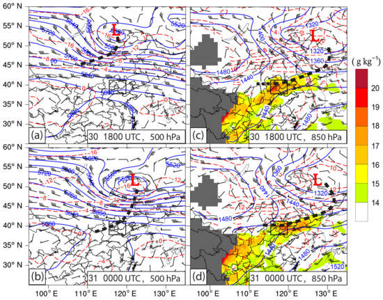 In order to study the environmental conditions of this convective storm, the 6-hourly, 1° × 1° gridded National Centers for Environmental Prediction (NCEP) Final (FNL) analysis data set (https://rda.ucar.edu/datasets/ds083.2/, accessed on 17 April 2021) was applied. At about 1200 UTC 30 July, a low pressure vortex began to occur in mid-troposphere (500 hPa) over the area near the eastern Baikal Lake southern Siberia, Russia, in association with a trough (figure not shown). At 1800 UTC 30 July (Figure 5a), the low pressure vortex (indicated by “L”) further developed during its continuous eastward movement. Meanwhile, the trough moved over the area near the border of eastern Mongolia and Inner Mongolia Province, China. At this time, the location of the low center at 850 hPa (Figure 5c) obviously shifted to the southeast where it was almost collocate with the northeastern border of Northeast China. Meanwhile, the trough extending from the low center had reached to the area over the northern boundary of the Shaanxi Province. The southern part of the trough was located over the northern part of the study area, delivering cold northerlies from the north. However, the central and southern part of the study area was controlled by a warm and moist air providing southwesterlies ahead of the trough (the maximum water vapor mixing ratio exceeding 18 g kg−1). Furthermore, a convergence can be generated by the northerlies and southwesterlies which came from either sides of the trough over the study area.