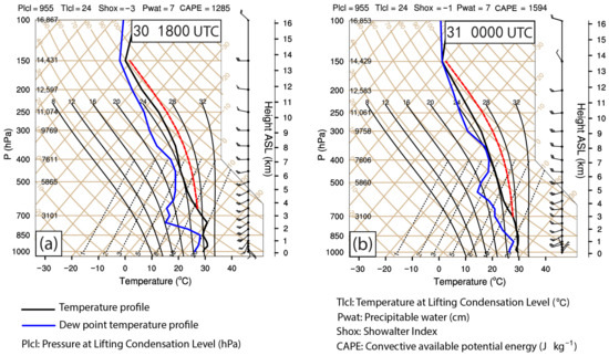 (a) Skew T-logP diagram derived from the NCEP FNL data (the location is marked with symbol “☆” in Figure 1) at 1800 UTC 30 July 2010; (b) is the same as (a) but for the time at 0000 UTC 31 July 2010.