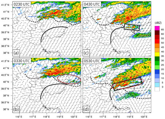 (a–d) Simulated composite reflectivity (shading, units: dBZ) and wind field (full and half barbs represent 4 and 2 m s−1, respectively) at 10 m height above the ground on 31 July 2010. The black solid lines indicate the locations of the SBF, and black dashed lines denote the locations of the GF. The black rectangle area indicates the merging area. The solid brown ellipse shows the area where the convective system significantly weakened and (or) dissipated. The dotted red ellipse indicates the area where convections initiated and (or) intensified due to the merger of the SBF and GF. The specific time is shown in the upper left corner of each panel.