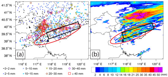 (a) Observed 6-h accumulated precipitation (colorful symbols, units: mm) observed by the ground-based automatic weather stations from 0200 to 0800 UTC on 31 July 2010; (b) Simulated 6-h accumulated precipitation (shading, units: mm) during the same period as (a). The black rectangle area indicates the merging area of the SBF and GF. The red ellipses indicate the area where precipitations were generated by the convections which were initiated and (or) intensified due to the merger of the SBF and GF.