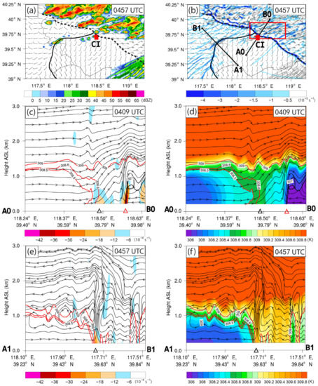 Figure 11c shows the evolutions of the averaged height, , and its three components along the backward trajectories of selected air parcels. During the 0442–0451 UTC, the twisting term increased significantly, and became remarkably greater than all the other terms, showing a sharp decreasing trend after 0451 UTC. The extension term revealed relatively weak positive contribution during 0445–0451 UTC, along with a very significant increasing trend after 0451 UTC. However, the horizontal curvature term showed relatively small positive effect on during 0448–0454 UTC, while it was almost negligible at other times. In general, the overall evolution of the during the early 10 min of the rapid lifting period was mainly affected by the vertical twisting term, while the extension term had a positive contribution to the during the last 12 min before CI. Especially, the extension term played a very significant positive role in the during the last 5 min before CI.