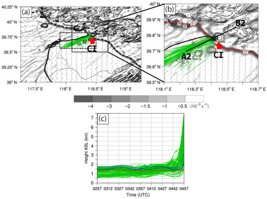 In order to obtain an intuitive grasp of the vertical twisting, the vertical cross section of the vertical shear of the horizontal wind (VSHW) along a line segment, which almost runs parallel through the center of the ground-relative backward trajectories of air parcels, are analyzed (Figure 12). The vertical cross sections of VSHW and locations (projected to the vertical cross section) of the air parcels indicated that (Figure 12a,b) as the air parcels lifted significantly during 0445–0551 UTC, most of the air parcels entered an area with high VSHW. Therefore, it can be inferred that most of the air parcels were affected by an environment with high VSHW where the air parcels exhibited a quite intense vertical twisting (analyzed above) due to the VSHW before the CI.