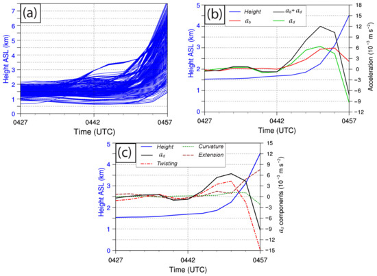(a) Height along the backward trajectories of air parcels with vertical velocities in the top 25% quantile at the CI time (i.e., 0457 UTC) within the selected convective cell in 30 min before CI; (b) Averaged height and vertical momentum components induced by dynamic force (), buoyancy (), and sum of them ( + ) along the air parcels selected within the convective cell in 30 min before CI; (c) Averaged height, dynamic acceleration (), and its three components (Curvature, Twisting and Extension) in 30 min before CI.