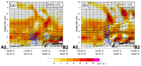 (a,b) Vertical cross section of the VSHW (shading, units: 10−3 s−1) and streamline along the line segment A2B2 in Figure 10b on 31 July 2010. The small blue circles indicate the location (projected to the vertical cross section) of the air parcels. It also shows the potential temperature (black solid contours at values of 306 and 307 K) that indicates the thermal boundary of the GF. The specific time is shown in the upper right corner of each panel.