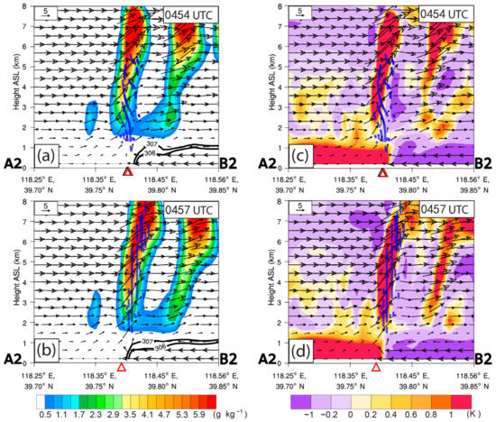 (a,b) Vertical cross section of the hydrometeors (including rain, cloud, ice, graupel, and snow) (shading, units: g kg−1) and wind fields (vector arrows) along the line segment A2B2 in Figure 10b on 31 July 2010. (c,d) are the same as (a,b) but for the potential temperature anomaly (shading, units: K). The specific time is shown in the upper right corner of each panel. The black and red triangle symbols indicate the locations of the leading edges of the SBF and GF, respectively.