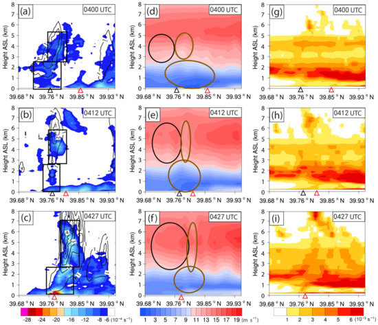 As the SBF and GF come close to each other, both of the weak convergence regions in different levels near the leading edge of the SBF underwent significant development both in size and intensity (Figure 15b,c). Meanwhile, zonal-mean HWV showed that (Figure 15e,f), both of the weak-wind regions were further squeezed, and the upper weak-wind region was elevated further upward (indicated by upper brown ellipse), along with an intensification of the HWV (max HWV reaching ~16 m s−1) in the near-upstream high-wind region (indicated by the black ellipse). Therefore, it can be inferred that the airflow moving from the near-upstream high-wind region to the upper weak-wind region was blocked (or decelerated) due to the significant velocity difference between these two regions. Therefore, a significant convergence can occur in the mid-level (i.e., 3–6 km AGL), which reflected the MBCE mentioned above. In general, the overall HWV structure was similar to that of the vertical cross section along line A2B2 shown in Figure 13, in spite of the whole pattern of the HWV was relatively weak, because it was smoothed out due to the zonal-mean calculation. The zonal-mean of the VSHW showed that (Figure 15g–i) there was a high VSHW region between ~0.7 km to ~4.8 km AGL above the region between these two fronts during the merger processes, which is also very similar to the situation reflected by the vertical cross section of the VSHW in Figure 12. Consequently, the results obtained according to the analysis based on the vertical cross section along line A2B2 are believed to be reliable and objective.
