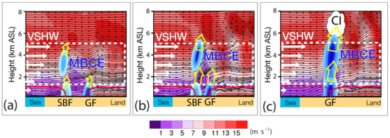 Schematic model summarizing CI mechanism affected by the mid-level blocking convergence effect (MBCE) and vertical shear of the horizontal wind (VSHW), which are considered the important dynamic force associated with the merger of the sea-breeze front (SBF) and the gust front (GF) investigated in the present study. (a–c) indicate the different status of the merger process. The background shading indicates the horizontal wind velocity (unit: m s−1). The blue-filled ellipses denote the convergence (including the convergent leading edges of the SBF and GF, as well as the mid-level convergence due to the MBCE). The white arrows indicate the horizontal wind velocity, and the dashed white box indicates the area where there are high VSHW which is responsible for the vertical twisting. The hollow arrows in yellow indicate the updraft induced by the convergence below.