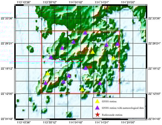 Since the meteorological observations are required for data processing and the constraints of a tomographic model, in this study, meteorological data including temperature, pressure and relative humidity with a 1 min sampling rate were collected from 11 surface weather stations in the Hong Kong, which can be downloaded from the Geodetic Survey Section of Survey and Mapping Office (https://www.geodetic.gov.hk/en/satref/satref.htm, accessed on 11 October 2021). Figure 1 shows the designated tomographic region and the geographical distribution of GNSS, weather and radiosonde stations used in this study.