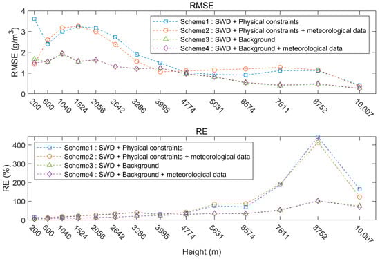 Figure 2 shows the mean RMSEs and relative errors (RE) of the WVDs at different layers of the constructed tomographic model at 00 and 12 UTC resulting from the four schemes. The RMSE of Scheme 1 under 3 km is above 2 g/m3, while the RMSE of Scheme 2 at the bottom layer significantly decreases after the surface meteorological data are used. The RMSE of Schemes 3 and 4 at all layers are less than 2 g/m3, which demonstrates the superiority of the use of background information or surface meteorological data in the tomographic process. Compared with Scheme 3, the RMSE of Scheme 4 is about 10.7% smaller, which demonstrates the effectiveness of the inclusion of as much meteorological data as possible. Unlike the RMSE, the RE increases with height because the WV amount decreases rapidly with the height.