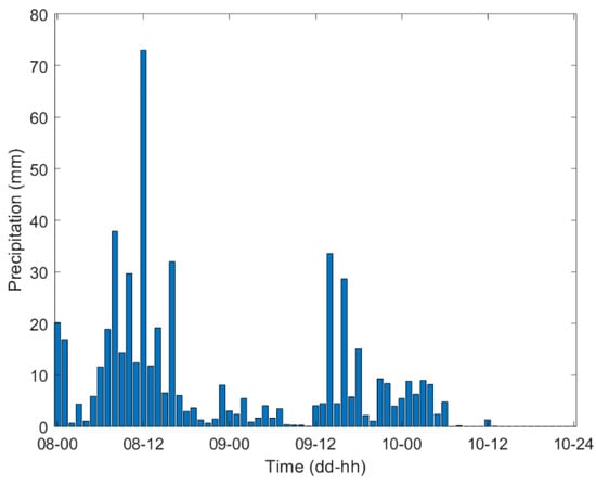 To investigate whether the tomographic results are affected by weather conditions, the accuracy of tomographic results for days with and without rainfall was investigated. Hourly precipitation data from the King’s Park station in Hong Kong were collected and used to classify rainy and non-rainy periods. As indicated by relevant precipitation records, Hong Kong experienced rainfall over the period 8–10 October 2021. Detailed hourly cumulative rainfall data collected in the 3-day period are presented in Figure 3.
