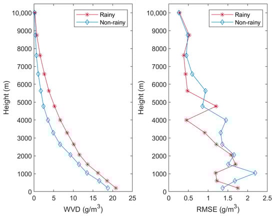 It can be seen from Table 5 that the accuracy of the tomographic results from Scheme 4 during rainy days is better than that during the non-rainy days. Figure 5 depicts the WVD and their RMSEs obtained from our refined tomographic model during the rainy and non-rainy days, respectively. It is notable that the WVD shows a smooth decreasing trend from a high layer to a low layer during both phases. At each layer, the WVD during the rainy phase is higher than that during the non-rainy phase. In addition, the RMSEs at different layers show large fluctuations, the value during the non-rainy phase is higher than that during the rainy phase at most of the layers, and the maximum RMSE is found at the layer of 1040 m.