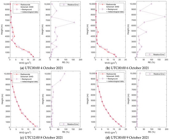 Figure 6 shows the variation of WVD and RE with height at four epochs during the above two phases. Compared to the rainy days, the REs of the tomographic results show large fluctuations at different height levels during the non-rainy days. This is mainly due to the fact that the WVD has a more complicated vertical structure during the non-rainy days than the rainy days. This also demonstrates that the vertical distribution of water vapor has an obvious influence on the accuracy of the tomographic technique. This phenomenon has also been proven in the previous study [76]. According to [76], large RMSEs of the tomographic model are found below 4 km and sharp growth in the RE values is also demonstrated in the height range. However, the accuracy of the refined tomographic model, i.e., Scheme 4, presents little fluctuations at all height levels, as shown in Figure 2.