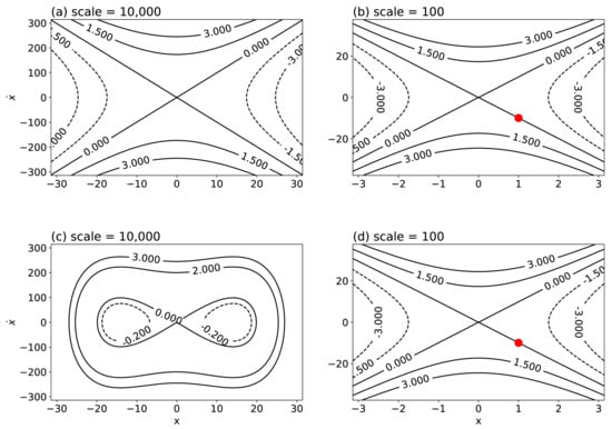 Inclusion of the nonlinear cubic term leads to two, non-trivial critical points at and (e.g., [31]). To reveal the role of the nonlinear term, we can simply compare the contour lines of the energy functions, Equations (2a) and (2b), for the nonlinear and linear systems, Equations (1) and (5), respectively. As shown in Figure 1c, two centers appear, as indicated by a family of nearby closed contour lines that enclose one of the centers. Each of the closed curves represents one periodic solution with a specific initial condition.