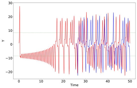 Two nearby trajectories within the L63 model with and . Solutions, in different colors, were obtained from the control and parallel runs. The only difference between the two solutions is that the parallel run adds a small perturbation () into the initial value of Y. The sensitive dependence of solutions on the initial conditions is indicated by the divergence of two orbits in blue and red. The two horizontal lines indicate the location of the non-trivial critical points.