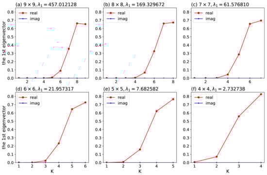The above conceptual model for the chain process is analyzed using Figure 5. Panels (a)–(f) display the first eigenvalues and the corresponding eigenvectors within a , , , , , and matrix, respectively. Based on Figure 5, we can observe that the first eigenvector contains several non-zero components at smaller scales. Secondly, the first eigenvalue becomes smaller within smaller sub-matrices. Therefore, we may say that smaller scale modes possess larger growth rates. Since the first eigenvalue is always positive and since the corresponding eigenvector contains components at smaller scales, Figure 5 indicates the possibility for a chain process.