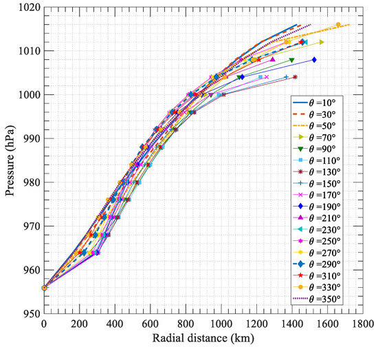 Solving the coupled wind-pressure system is extremely challenging, therefore an alternative approach consists of prescribing the pressure field based on field-measurement data as it is usually done for TC systems. While the pressure field is typically assumed to be symmetric inside TCs, the complex ETC structure imposes an azimuthally dependent pressure profile. To this end, a 2-D parametric formula of the asymmetric pressure field based on the ERA-Interim data is developed in this study. To derive an empirical expression of the pressure field, the composite ETC pressure radial variation at various azimuthal locations will be first examined [28]. As shown in Figure 2, the surface pressure varies with respect to both radial and azimuthal spatial coordinates.