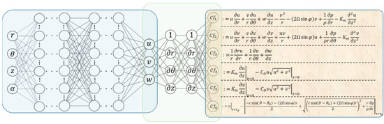 In this study, ETC boundary-layer winds are approximated by a fully connected, feedforward KEDL system with a hyperbolic tangent activation function and a network architecture of 8-100-100-100-100-100-100-100-3. The inputs required for the ETC boundary-layer wind simulation are the spatial coordinates and the ETC parameters denoted as where is the surface roughness (to obtain the drag coefficient through and = von Karman constant). The three model outputs of representing the wind velocity components with respect to the cylindrical coordinate system . While there is a lack of general rules for the determination of the optimal model architecture [60], an exhaustive trial-and-error approach is usually followed [61]. A simplified representation of the KEDL architecture is presented in Figure 3, where the governing equations-based cost functions (, , ) and the boundary condition-based cost functions (, ) are incorporated in the system.