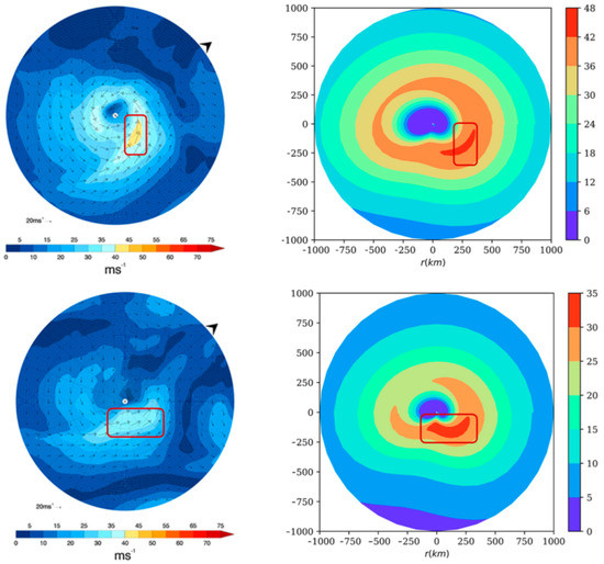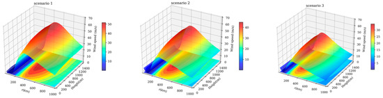 On the other hand, Figure 7 presents the spatial distribution of simulated wind speed at three different levels (i.e., 10 m, 500 m, and 1000 m) with , , , , and . The simulation results indicate that the spatial distribution of the wind field inside ETC presents a comma-like shape, which is a common feature of ETC boundary-layer winds.