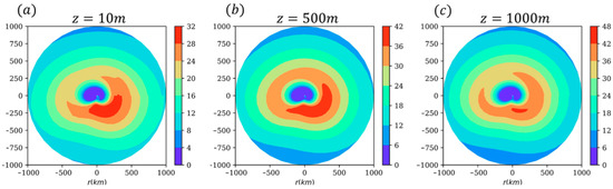 Spatial distribution of the ETC wind at three different altitudes: (a) ; (b) ; and (c) .