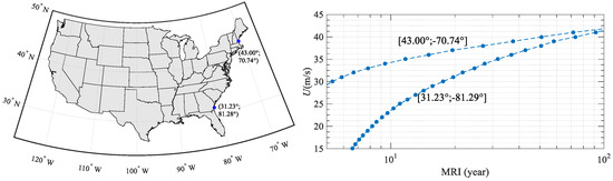 The distribution of the 10 m-height ETC wind speeds at two selected points (31.23°; 81.28°) and (43.00°; 70.74°), located in the US southeast and northeast, were accordingly constructed and depicted in a logarithmic scale as shown in Figure 8. According to Figure 8, the distribution of wind speed at location (43.00°; 70.74°) is higher than that at location (31.23°; 81.28°). This observation is expected, since the northeast location is more frequently impacted by nor’easters compared to the southeast location.