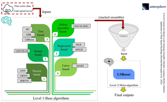 - Level 1: WS was modeled using eleven ML algorithms, including ANN, MLR, MNLR, GRNN, MARS, M5, GBR, RBFNN, LSBoost, LSSVM-GS, and LSSVM-HHO, at sixteen stations.