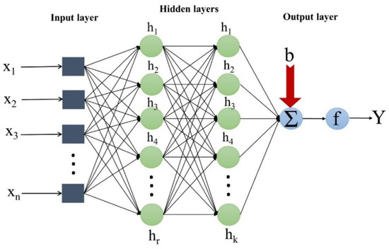 ANN is one of the most popular ML algorithms with a short computational time. It is capable of nonlinear modeling functions [31]. ANN is inspired by a process similar to the human brain to solve various problems. ANN is a data-driven algorithm used to develop the relationship between input and output variables [32]. The ANN comprises different layers (i.e., input, hidden, and output), each containing several neurons (Figure 2). Recently, ANN has been used to model various parameters. In ANN, the relationship between input (x) and output (Y) is as follows: