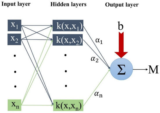 The LSSVM was first proposed by Suykens et al. [47]. The LSSVM is an improved algorithm based on the SVM used for regression analysis, classification, and pattern recognition. This algorithm uses linear relationships instead of nonlinear relationships between inputs (x) and output (M) and significantly improves the accuracy and speed of the SVM. The regression function between input and output in this algorithm is as follows: