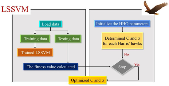 Since the C and σ parameters significantly impact how the LSSVM works, it is essential to determine the optimal values of these parameters. Therefore, this study used the HHO optimization algorithm to find the optimal value of the LSSVM parameters. The LSSVM-HHO flow chart is shown in Figure 4. The values, C and σ, are considered decision variables in the hybrid algorithm. In this algorithm, first, training and testing data are randomly selected. Then, the initial parameters of HHO and the initial population of LSSVM are initialized to search for the C and σ values. In the next step, first, the training data are used to obtain the optimal LSSVM. Finally, the testing data are used to evaluate the predictive ability of the LSSVM.