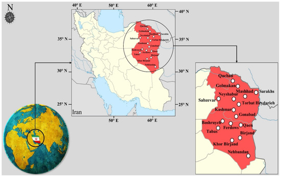In this study, sixteen synoptic stations located in the east and northeast of Iran were used to model WS and prove the performance of the proposed framework. Nine stations, including Quchan, Sarakhs, Sabzevar, Golmakan, Mashhad, Neyshabur, Torbat Heydarieh, Kashmar, and Gonabad, are located in Khorasan Razavi Province, and seven stations, including Tabas, Ferdows, Qaen, Birjand, Nehbandan, Boshruyeh, and Khor Birjand, are located in South Khorasan Province. The geographical characteristics of the studied stations are stated in Table 1. This region has high potential for the construction of wind farms. Due to the presence of one of the most important wind power plants in Iran in Neyshabur, modeling and predicting WS in this region is very important. In addition, many wind power plants are being built in this area, proving the importance of studied stations. Figure 5 shows the position of the stations used.