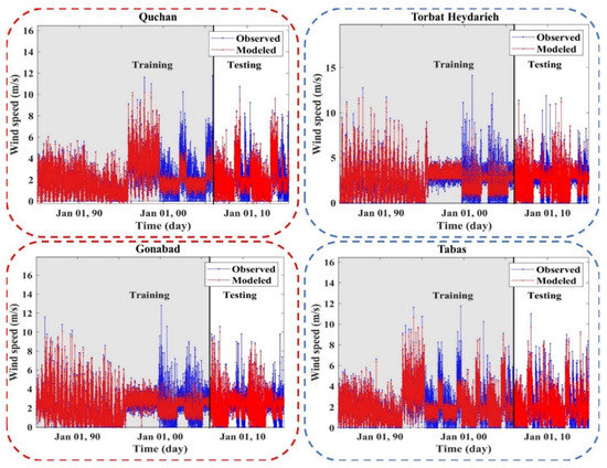 Time series of the observed and modeled values of WS using the meta-algorithm at different stations.