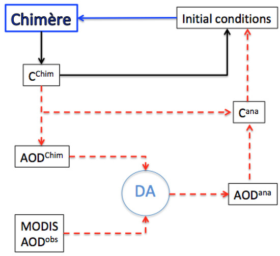 The default configuration of the model without DA consists of taking the initial concentration of a given species i, given size section j and at a given time step from the output concentration computed from the previous time step. The configuration with DA suggested in this study is based on a “Forecast-Analysis Cycling Scheme” and consists of using the model output AOD as the first guess and satellite AOD as input observations to generate the analysis of AOD, with which the model’s output concentrations are adjusted and fed back to the model as initial concentrations, instead of taking model output concentrations as the initial conditions, as shown in Figure 1.