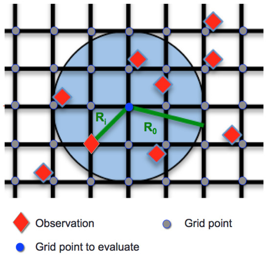 The objective analysis of AOD at a grid point m was performed by successive corrections using Equation (2). The successive correction method used in this work was the Creesman scheme, which uses satellite observations within a prescribed radius of influence as shown in Figure 2, and observations outside the influence radius were not used to assimilate the AOD field: