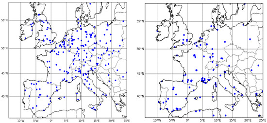 AirBase (https://www.eea.europa.eu/data-and-maps/data/airbase-the-european-air-quality-database-8, accessed on 28 April 2022) gathers regulatory data reported by Member States of the European Union according to the air quality directives [57]. For this study, quality-controlled and assured hourly PM data from both rural and urban background stations were used. Figure 3 shows the locations of the AirBase stations over Europe used here.