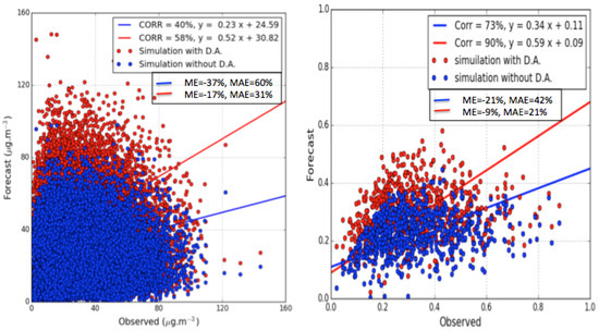 Using the default simulation without the DA, the modeled surface concentrations of PM are significantly underestimated by a factor of about 47% (the measured and modeled means are 38.01 and 20.01 g·m, respectively). The goal criteria are not respected as the mean fractional bias and error are and 51%, respectively. This underestimation is mainly due to the fact that the model highly underestimates PM concentrations over the urban background stations but modeled PM concentrations agree better with the observed concentrations over the rural background. The reasons of this underestimation were explained by Terrenoire et al. [59] who showed Chimère has more difficulty in reproducing the PM concentrations during winter, especially at urban background stations because the model is not able to correctly simulate the stable meteorological conditions that lead to high PM episodes [60].