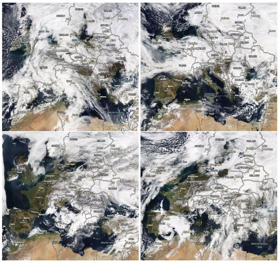 Table 5 shows the temporal and spatial sum of relative differences between the simulations with OA computed with R and R, respectively, over the cells where the effect of OI exceeds 20%. The comparison shows that the model performance is slightly sensitive to the influence radius value: the relative difference between the two simulations do not exceed 10.5 (12.3)% for PM concentrations (AOD). This may be due to the low satellite observation density during winter because of dense cloud coverage. Figure 8 shows the cloud coverage (MODIS Terra-corrected reflectance with a spatial resolution of 250 m) over Europe on four different days in March as examples of where the majority of the European land is masked by clouds. The results are expected to be more sensitive to the influence radius if the satellite data were of better quality or obtained during summertime.