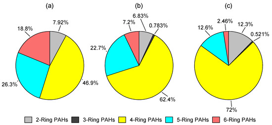 Distribution of PAHs emissions according to the number of aromatic rings: (a) WL; (b) FL; (c) EX.