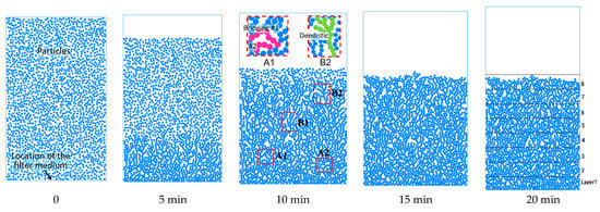 The simulated particle deposition process with a density of 1000 kg/m3 and a rolling resistance coefficient of 0.5 is shown in Figure 1. A computer with a CPU model of i7-10870H, a main frequency of 2.2 GHz and a RAM of 12 G was used for calculation, and the calculation time was about 20 min for each case. Initially, the particles were randomly distributed in the computational domain. During the deposition process of the particles on the surface of the filter material, the movement form included not only the sliding on the surface of the existing deposited particles but also the rolling of the particles themselves so that the particles were gradually deposited by the “bridging” (e.g., most of the particles in regions A1 and A2) or “dendritic” phenomenon (e.g., most of the particles in regions B1 and B2). The “bridging” phenomenon describes the situation in which the particles slide down on the deposited particles, connecting more with adjacent particles, making the particle layer more compact. A “dendritic” structure occurs when the particles are sticky enough to resist slipping, so they stick to the particles that have already been deposited and no longer roll down, resulting in a more stable and looser structure. From 15 to 20 min, the particles moved (sliding or rolling) relatively slowly and tended to stably deposit. Finally, the particle deposition morphology became stable, and there was a certain porosity.