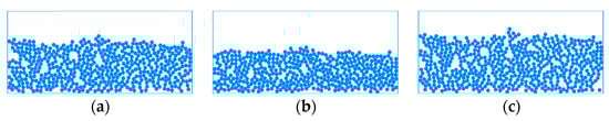 Figure 2 shows the particle deposition morphologies under conditions of a density of 1000 or 2500 kg/m3 and a rolling resistance coefficient of 0.2 or 0.5. Comparing Figure 2a,b, it was found that the greater the density, the more obvious that the “bridging” phenomenon occurred in the filter cake. The deposition morphology corresponding to a density of 2500 kg/m3 (Figure 2b) was tighter than that of 1000 kg/m3 (Figure 2a). This was mainly because the adhesion force between particles was not enough to counteract the downward movement trend caused by the particle’s gravity. Comparing Figure 2a,c, the particles with a larger rolling resistance coefficient formed the looser filter cake. The reason for this was that the larger the particle rolling resistance coefficient, the greater the viscosity and the lower the sliding effect of the particles, leading to the more obvious phenomenon of “dendritic” deposition, which is consistent with a previous study [].