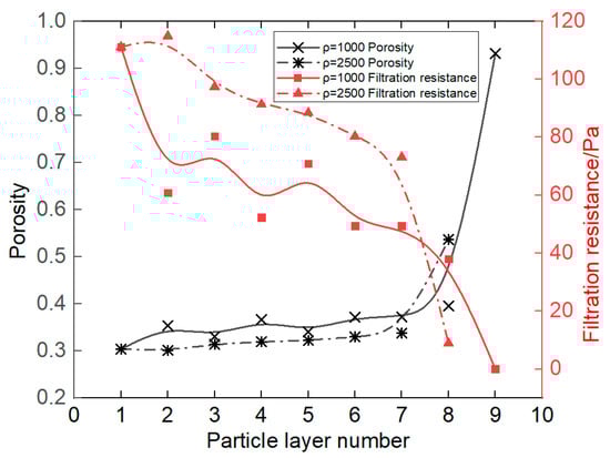 Figure 3 shows the calculated layered porosity and filtration resistance of the filter cake when the particle rolling resistance coefficient is 0.2 and the densities are 1000 and 2500 kg/m3. With the increase in the particle deposition height, the layered porosity of the filter cake gradually increased from 0.3, while the layered filtration resistance decreased from 113 Pa. The corresponding filter cake deposition morphology (layers 1–7) was more compact when the particle density was 2500 kg/m3 compared to when it was 1000 kg/m3. The main reason for this was that the “bridging” phenomenon between particles was more obvious in the case of a higher particle density (referring to Figure 2a,b), and the number of particles in layers 1–7 of the filter cake was higher, resulting in a smaller filter cake porosity and a greater filtration resistance. Because the particles were densely distributed at the bottom, the eighth layer had fewer particles, which resulted in a higher porosity of the filter cake and a lower filtration resistance.