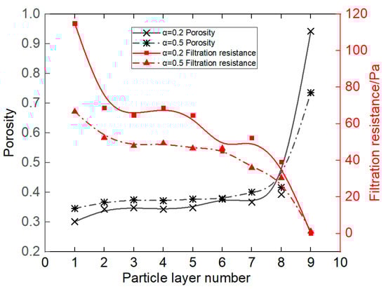 The effect of the particle viscosity (characterized by the rolling resistance coefficient) on the filter cake porosity and the filtration resistance was further analyzed (Figure 5). When comparing the cases of rolling resistance coefficients α of 0.2 and 0.5 under a density of 1000 kg/m3, it was found that the larger the rolling resistance coefficient, the larger the layered porosity of the filter cake and the smaller the filtration resistance. The variation trend of the layered filtration resistance of these cases was similar, but the values were very different. For example, in the first layer, when the rolling resistance coefficient α was 0.2, the filtration resistance was 115 Pa; when the rolling resistance coefficient α was 0.5, the filtration resistance was 67 Pa. It was found that, as the rolling resistance coefficient increased, the compressibility of the filter cake became lower, and the filtration resistance of the filter cake significantly decreased.