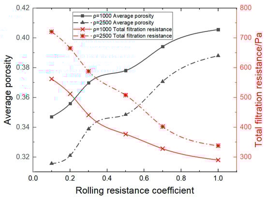 The average porosity and the total filtration resistance of the filter cake corresponding to the rolling resistance coefficients (0.1~1.0) are shown in Figure 6. In cases where the densities were 1000 kg/m3 and 2500 kg/m3, the average porosity of the filter cake increased with the increase in the rolling resistance coefficient; the total filtration resistance decreased as the rolling resistance coefficient increased; and the rate of decrease decreased with the increase in the rolling resistance coefficient. For example, when the density was 2500 kg/m3 and the rolling resistance coefficient (α) was 0.7, the total filtration resistance was 403 Pa, which is 319 Pa lower than when the rolling resistance coefficient (α) was 0.1. This indicates that the more viscous the particle (the larger the coefficient of rolling resistance), the lower the compressibility of the filter cake, and the filter cake showed a looser structure, resulting in an increase in the average porosity of the filter cake and a decrease in the total filtration resistance.